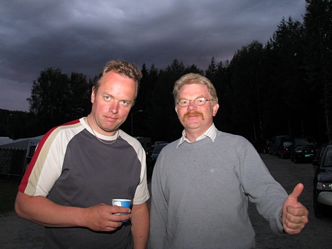 En av "kara frå Fron" - Stig Ove Lostad - konverserer over en ka..ffekopp (?) med "festgeneral" Jørn Hansen, med tommelen opp - selv om vi aner noe skummelt bygge seg opp i bakgrunnen ... |