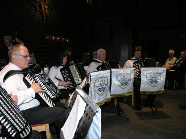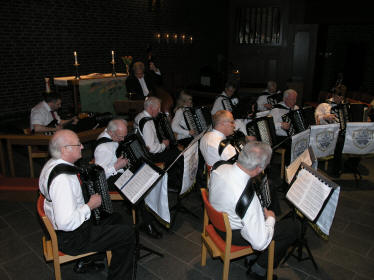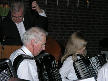 | Tor Hveding (t.v.) er musikalsk leder sammen med Simen Korsvold. Per Bredesen på kontrabass var innlånt for anledningen og hadde mange nye noter å forholde seg til... | Pål Arve Solberg (t.v.) og Yngvar Strøm i trekkspillduetter akkompagnert av Ole-Herman Finholt på gitar og Per Bredesen på kontrabass. |