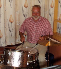 Bjarne Nordsletten (Ballan) som alltid smilande bak trommene, sjølv om øktene kan bli i drygaste laget. |