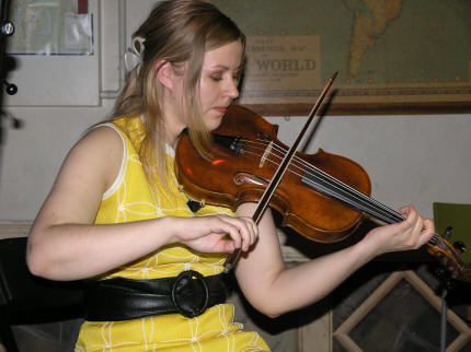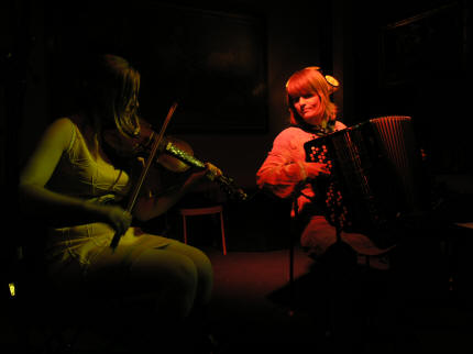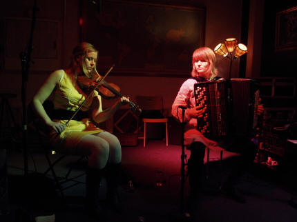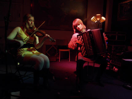 Innimellom fremføring av låtene spøkte jentene uanstrengt om vitsemakernes yndete objektomtale av hardingfela som djevelens instrument, og trekkspillet som vel også fått sin plass et sted det skal være godt og varmt. Irene er også av den oppfatning at både trekkspillet og bratsjen er omtrent likeverdige når det gjelder "repertoaret" av de verserende mer eller mindre dårlige vitsene. |