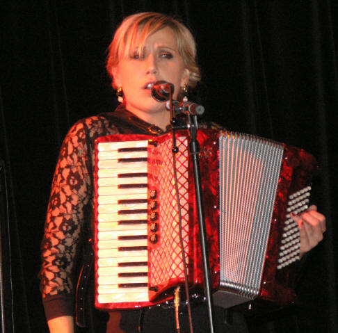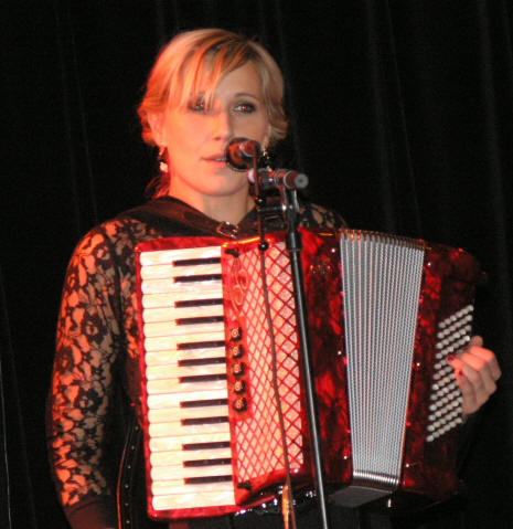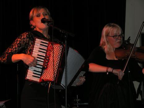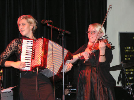 Guro entret scenen og opplyste at det var 1 ½ år siden hun og Line Grenheim på fele holdt en mini duokonsert i rommet ved siden av på Soria Moria. Den gang var det ikke i hennes tanker at hun i dag skulle stå foran en fullsatt sal på sin egen slippfest..., og nytt trekkspill har det også blitt det siste året - se Guro på "Gloria Flames". "Vi skal spille platen fra A til Å og starter med Accordion Night", sa Guro til ellevill jubel. Medmusikerne på platen var også med på scenen - Line Grenheim (fele), Anders Aarum (piano mm.), Sebastian Haugen (kontrabass) og Totto Hansen (trommer) i tillegg til kordamene Dina og Tonje. |