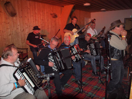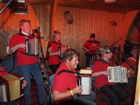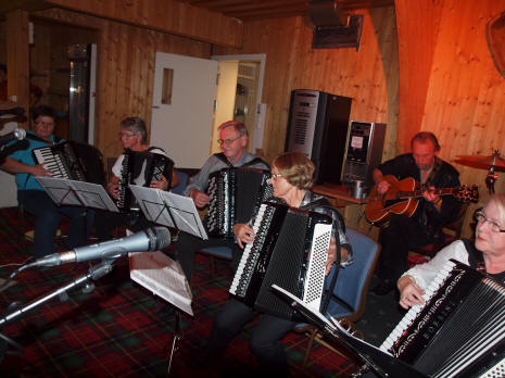 | Mer Moss trekkspillorkester ikledt sine buseruller |
