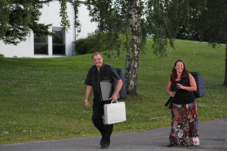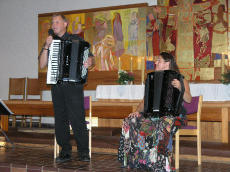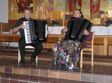 | "Vi skal åpne med det russiske stykket "I det fjerne lyder byen" for å sette dere i den rette stemning", sa Lena S. Rist-Larsen idet hun introduserte seg selv og Jörgen Sundeqvist som trekkspill-duo. |
