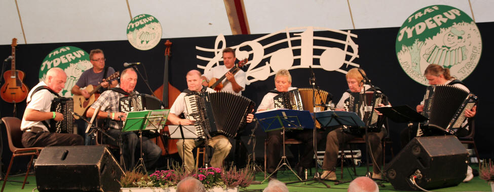 Jyderup Harmonikaklub med Mogens Bækgaard i spissen kunne i år ønske velkommen til det 20. trekkspilltreffet i Jyderup, som er lokalisert ca. 2 timers kjøring vest for København. Træf Jyderup er et av Danmarks største trekkspilltreff og er spesielt kjent for høy musikalsk kvalitet. Treffet har for lengst fått sin egen sang og med verselinjen "Det' altid uge 33 at vi møder op" er det lett å merke av i kalenderen år etter år. Et gedigent rødt og hvittstripete sirkustelt som blir satt opp på idrettsplassen for anledningen sørger for at folk har tak over hodet. Himmelens sluser åpnet seg i begynnelsen på uka og lagde bassenglignende tendenser både inni og utenfor teltet. De holdt imidlertid for det meste tett, som godt var, fredag til søndag mens treffet pågikk. Med annonsering om 31 timers musikk og dans i to telt, ble man nødt til å programsette også opptredener i kafeteriaen - populært kalt "Harmoniteriet". |
