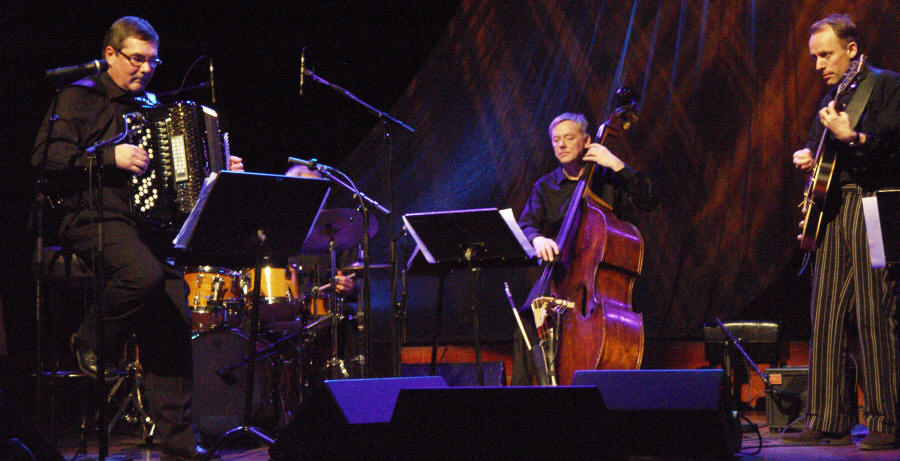 Neste par ut - som faktisk var et fullstort Hønefoss Storband fremførte “Up Front” av Lennie Niehaus og var kveldens omtrent eneste “trekkspillfrie” innslag. Et fint avbrekk var også Ketil Rasmussens vokal- og solistinnslag med storbandet. Han er også kjent som “bassisten i Nordkappkvintetten”, men det er som nevnt lenge siden det. Det var ikke uten grunn at Hønefoss Storband var invitert, for som siste innslag før pausen fremførte de Harald Gundhus komposisjon “Suite for accordion and jazz band” med selvsagt Kjell Harald Langhaug som solist. Noen av oss har nok fått med oss dette artige verket ved et par tidligere anledninger, men ingenting er som å oppleve det i en fin konsertsal og i en slik god “setting”. |