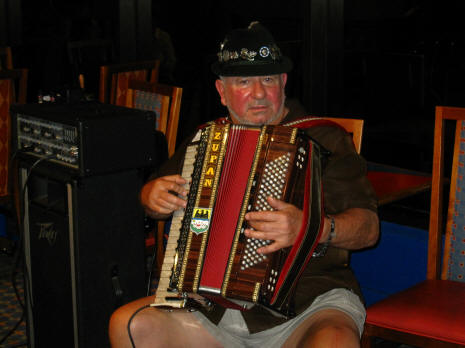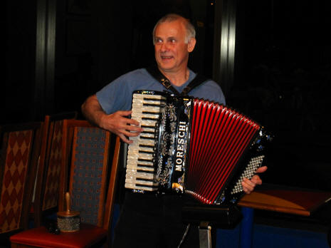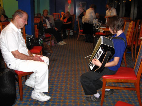 Fredag kveld møttes man som sedvanlig til uhøytidelig spilling i caféen på hotellet, sydd sammen av Alvaro Barsi, der alle var velkommen til å bidra. Et par unge trekkspillere, Jamie (11) og Ryan (13), fikk også prøvd seg der som solister. |