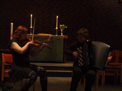 Dernest var det Marit Vestrum og Bente Midtsveen sin tur som henholdsvis trakterer fiolin og trekkspill. Kveldens musikk var hentet fra Nord-Trøndelag og Valdrestraktene, nettopp fra jentenes opprinnelsessteder. I en moderne kledning ble brudemarsjer, polsdans, vals og springare framført på løpende bånd - alle i egne spennende arrangementer der nok Midtsveen har spilt en vesentlig rolle. |