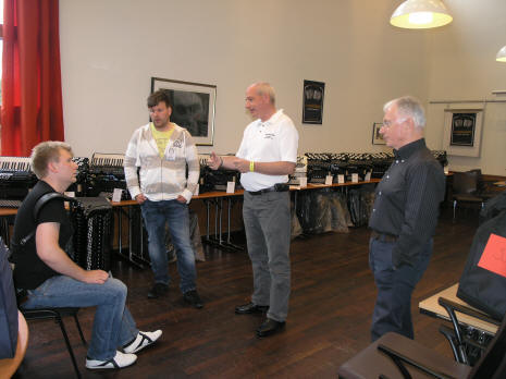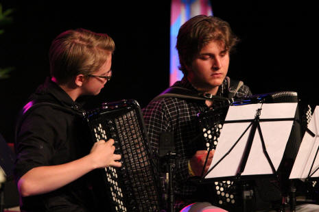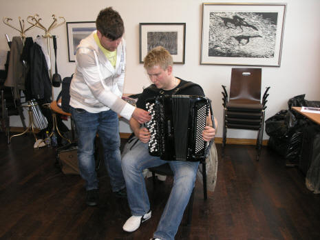 | Lærerne Glenn Sørskår og Kai Hansen, som også var NM-dommere tok seg også tid til å prøve Bugaris nye "student-bajan". | Glenn Sørskår (t.v.) og Kai Hansen |