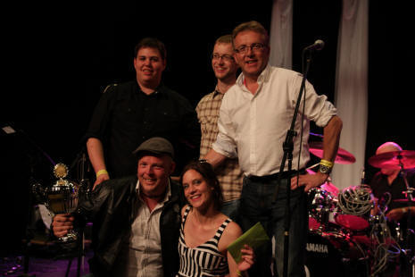 | ...og dermed ble årets Superfinale vunnet av "Knerten & Co." som fikk sitt første napp i vandrepokalen. Denne må vinnes tre ganger for å få den til odel og eie. | Bak f.v.: Vegard Hansen, Mats Tony Lileng, Reidar Dahle, Eddy "Knerten" Lyshaug og Anne Ragnhild Trondsgård Leren |
