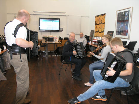 | Jo Asgeir Lie, NM-dommer og lærer, testet også den nye Bugari "student-bajan" | Dommerne i Superfinalen i gammeldans i konsentrasjon: Stein Magne Eggen, Ingunn Bjørgo, Irene Tillung, Kaj R. Endresen |