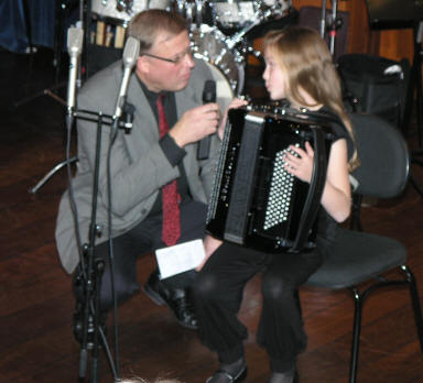 | Jörgen Sundeqvist i en liten "passiar" med Anna før hennes fremførelse | Solister t.o.m. 11 år: Anna Ouff Grøthe - "Tango Ultimo", komponist: Anders Grøthe |