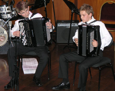 | Solister 15-17 år: Halgrim Kvello Stake - "Asturias", komponist: Isaac Albeniz, bearbeiding: Friedrich Lips - "Variasjoner over den russiske folkemelodien, "Å, kjære vinter"", komponist: Nikolai Risol | Duetter t.o.m. 14 år: Einar Thokle Hovden (t.v.) og Amund Schjøth Bunkholt - "Garmoshka", komponist: Vladimir Zubitsky. Notestativene ble så satt tilside og de var klare med en flott innsats med "Svenneprøva", komponist: Jo-Asgeir Lie |