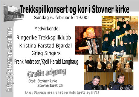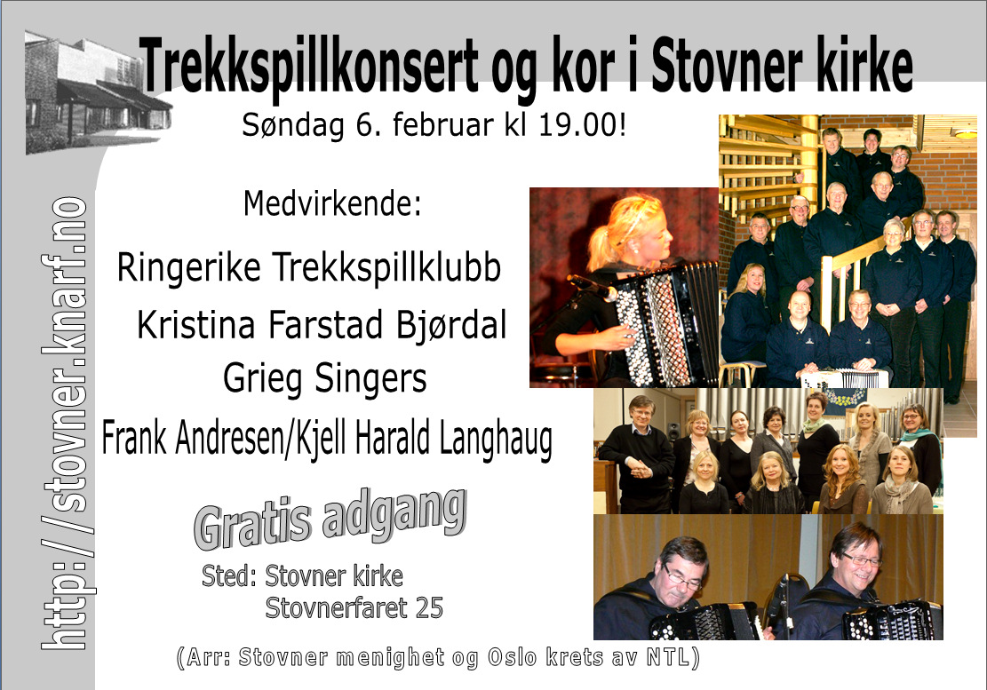 Allerede én uke etter vigslingen av Stovner kirke var Hønefoss Trekkspillorkester under Elfrid og Arild Formos ledelse invitert til å være en del av konsertprogrammet. Snart 30 år etter var det nok en trekkspillklubb fra et "annet rike" som var invitert - nemlig Ringerike Trekkspillklubb (RTK) med sin musikalske leder Steinar Eriksen. 6. februar 2011 var det klart for den 19. konserten som Oslo/Akershus krets av NTL (Norske Trekkspilleres Landsforbund) og Stovner menighet arrangerer hvert år. |