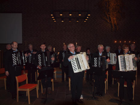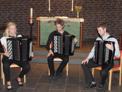 I konsertkonseptet er det alltid med en trekkspillsolist. Kristina Farstad Bjørdal fra Tennfjord går 2. året på Norges Musikkhøgskole (NMH). Hun startet med komposisjonen "La Poule" (høna) av franske Jean Phillippe Rameau. Hennes neste solonummer var 1. og 2. sats fra et russisk verk av A. Kholminov - "Song og Scherzo fra suite". "Håper dere får det gøy mens jeg spiller", sa Kristina for Scherzo betyr visst "spøk". Hun hadde valgt ut ytterligere to underholdende komposisjoner der hun fikk hjelp av medspillerne Eilev Øverbø og polske Greg Mishchyshyn som for tiden er utvekslingsstudent på akkordeon ved NMH - "Stars" og "Carrousel". I år var det ikke mange ledige sitteplasser å observere. Mange av publikummerne kommer til konserten også for kanskje å treffe bekjente de ikke har sett på lenge. Etter pausen, som altså er meget betydningsfull sosialt sett, var det flere godbiter igjen på programmet. Et kor blir også alltid invitert. I år var det "Grieg Singers". Bare navnet ga oss høye forventninger, og vi ble ikke skuffet. Koret ble stiftet høsten 2010 og består kun av damer som er fagutdannede hva vedgår sang eller gode amatører. Den eneste "hanen i kurven" er dirigenten Rolf Nykmark. Dette var korets første offentlige opptreden, og vi fikk presentert "Kveldssang for Blakken", "De norske Fjeld" og "Sporven" i vakre originalarrangenter av Edvard Grieg. De avsluttet sin avdeling med en gammel komposisjon fra 1830, "Veni Domine, op. 39" av en den gang meget musikalsk moden 21-årig Felix Mendelssohn Bartholdy.