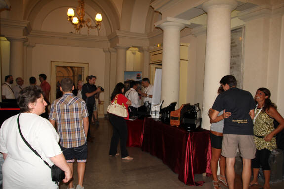 | Inngangen til Teatro Nuovo hvor konkurransene og konsertene fant sted | Flere trekkspillprodusenter hadde utstilling i foajeen |