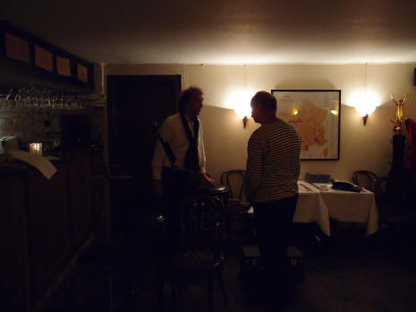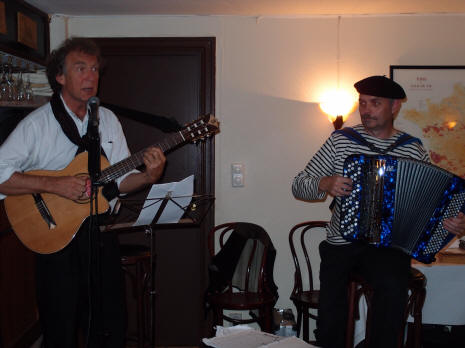 "Det er lov å prate under konserten, for det gjør folk vanligvis når jeg spiller", sa Lars-Gøran før han startet med "Les bicyclettes de Belzise" deretter etterfulgt av "pliktnummeret" "Sous le ciel de Paris" (Under Paris’ himmel). CDen inneholder både raske og rolige melodier. Men tilhørerne foretrakk tydeligvis å lytte denne kvelden. Andre smakebiter fra platen ble "Petit Fleur" og "Le bal de la marine". Deretter var det tid for en liten pause med virkelig smakebiter, dvs. ulike franske tapas- og småretter. Til andre del av konserten hadde Lars-Gøran invitert med sin gode venn og spillekamerat, Morten F. Lund. De to traff hverandre for 15 år siden på en fransk aften på Kolbotn. Siden har trubaduren Morten ofte spilt gitar med Lars-Gøran, og de har sågar spilt i Frankrike sammen - også under ett bryllup på et slott i Bordeaux. Kveldens avslutningsnummer med sang ble "Champs Elysees" som faktisk ikke er fransk slik mange tror, men derimot amerikansk.