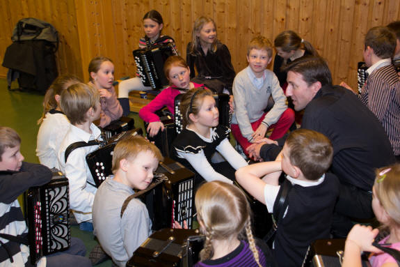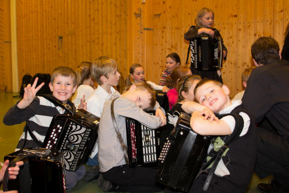Det kan bli livlig når 18 små skal gjøre seg klare til å gå på scenen – mange for første gang. Og ikke bare skal de på scenen, men de skal ha trekkspill på magen også. Lars Røyseng bøyer seg ned mens de sitter på gulvet og venter. Noen snor seg litt utålmodig rundt, mens andre er mer preget av stundens «alvor». Han kan skilte med god erfaring med barn, da han og Stian Aase reiste rundt i flere år på ulike skoler i Norge i forbindelse med «Den Kulturelle Skolesekken». Mange barn ble på den måten introdusert for instrumentet trekkspill. Lars arbeider nå bl.a. som musikklærer for Sande kulturskole og Bærum kulturskole. Det var i fjor en del ledige plasser på trekkspill i Bærum kulturskole. Ettersom Lars også arbeider som musikklærer på Bærums Verk skole hvor det er en musikkinteressert rektor, fikk de til i samarbeid med skolen og kulturskolen nok midler til en stillingsbrøk slik at Lars kunne ta initiativet til å starte med trekkspillundervisning for de små. |