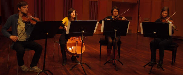 | Evelina Petrova (t.v.) med sitt prosjektorkester | F.v.: Haakon Aase (fiolin), Paula Cuesta Redondo (cello), Sarah-Jane Summers (bratsj), Laura Ellestad (hardingfele) |