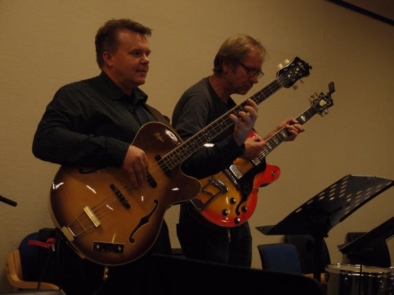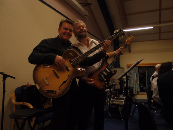 | To glade "kompgutter" - Vidar Stenseth (t.v.) og Ole Finholt | Busk- og prøvespilling på salgsutstillingen til 3KKSPILLTROLL av ulike merker og nye modeller |