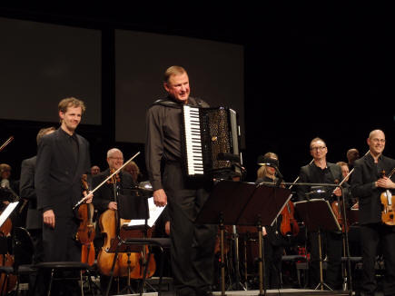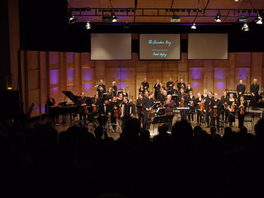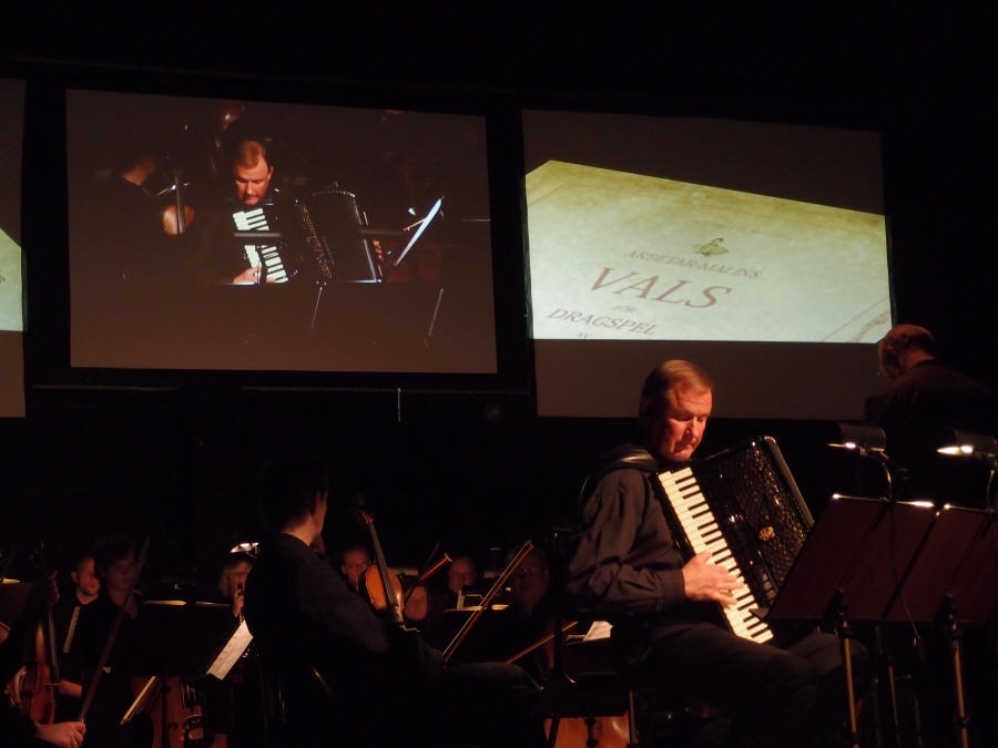 Konserten ”The Accordion King” er en hyllest til «Ådalens dragspelskungar» og varer 35 minutter med Sundeqvist som trekkspillsolist. En film vises på tre lerret på veggen bak orkesteret. Filmen er også laget av Högberg og har mange humoristiske innslag der bl.a. han selv medvirker. Likevel blir vi minnet om alvoret hos datidens fattige skjebner som ulmer i bakgrunnen. Tømmerfløting og papirfabrikker var hovednæringen langs elven. Sykkelen var et vel så viktig redskap for trekkspilleren som instrumentet for å kunne komme seg rundt til de ulike danselokaler, så det gjaldt å stelle pent med denne. De arbeidet hardt om dagen og syklet milevis i helgene for å spille. Högberg har tilpasset musikken nøye underveis til filmen – eller motsatt , for selv om folk var fattige og hardtarbeidende fant de glede og avkobling i musikken. Konserten inneholder musikk i et annerledes tonespråk og er tildels nyskapende, men har også mange og lange meget melodiøse partier. Som f.eks. når det danses til «Arbetar-Malins vals». Vi spøkte på forhånd med at vi i alle fall ikke regnet med å få høre «Afton på Solvik», men for de som hørte nøye etter kunne man dra kjensel på strofer fra både denne og «Månsken över Ångermanälven». Partiene som tar for seg fabrikkarbeidet beskriver dette med et mer intens tonespråk og Sundeqvist får her bare «jobba på» med fingrene på tangentene og dette blir viruost fremført av ham. Flere av disse hurtige partiene fremføres parallelt med orkesterets pianist som også har nok å henge fingrene i. Vi kunne ønsket oss at trekkspillsolisten i visse partier hadde vært noe mer fremtredende i lydbildet – spesielt venstrehånden hvor det finnes mange intrikate bassganger - (ja, vi har sett partituret). |