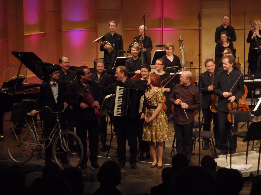 | Komponist, solist, dirigent, skuespillere og orkestermedlemmer - alle godt fornøyde :-) |