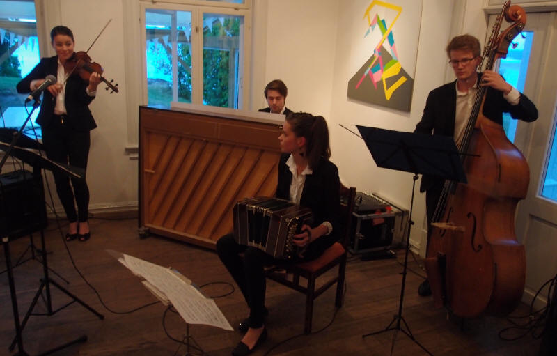 Søndag 9. august var det mer enn bare sommerstemning som lokket folk til Hellviktangen på Nesodden i Oslofjorden. «Los Osos Polares» har i år vært på sommerturne med konserter i Alvdal, Hamar, Lillehammer, Nesodden, Kongsvinger, Elverum og med Grand Finale i Storstuggu på Røros. Vi må innrømme at vi etter søk på Google translate fant ut at Osos Polares betyr isbjørn på spansk. De synes selv at dette var en passende navn på en norsk gruppe som forsøker å formidle varm og temperamentsfull argentinsk musikk. Kvintetten består av Ingrid Nyhus (vokal), Rannveig Ryeng (fiolin), Åsbjørg Ryeng (bandoneon), Håkon Magnar Skogstad (piano) og Ole Herman Schøyen Sjölin (kontrabass), og er dermed et autentisk argentisk tangoorkester som krever at man har med minst ett bandoneon i besetningen. De startet opp i 2009 og er godt skolerte hva gjelder musikalsk bakgrunn. Åsbjørg Ryeng avsluttet sitt kandidatstudie i mai ved Norges Musikkhøgskole med Bacheloreksamen og eksamenskonsert på det ikke så rent kompliserte instrumentet – bandoneon. Bandoneonet ble oppfunnet i 1855 av tyske Heinrich Band (1821-1860) og var opprinnelig tenkt å fungere som et transportabelt kirkeorgel, men havnet fort i et noe annet miljø på bordellene i Argentina. Åsbjørg hadde en liten demonstrasjon av hvordan knappesystemet på instrumentet fungerer – eller helst kanskje mangel på system. |