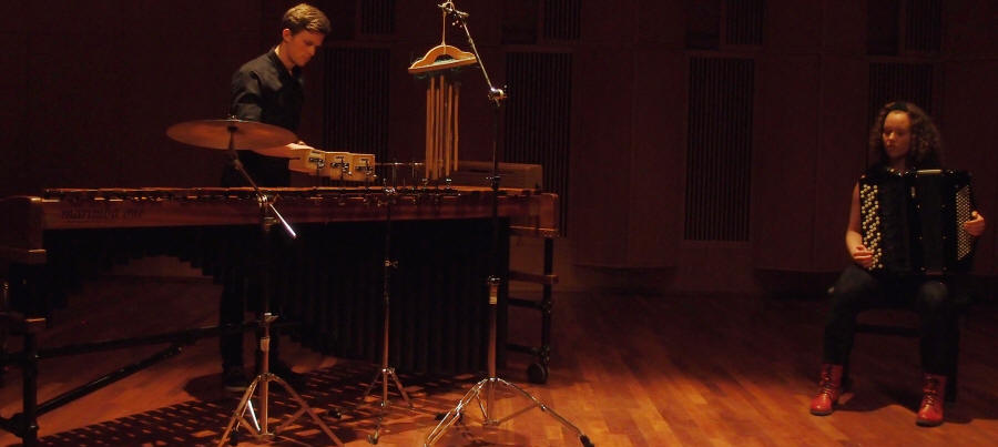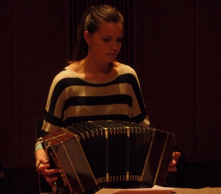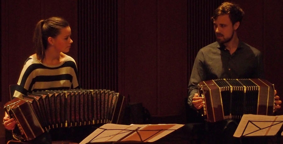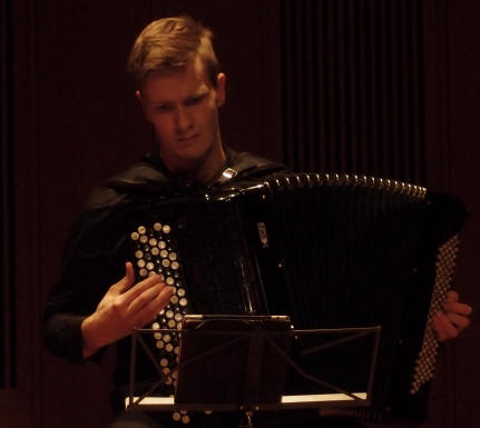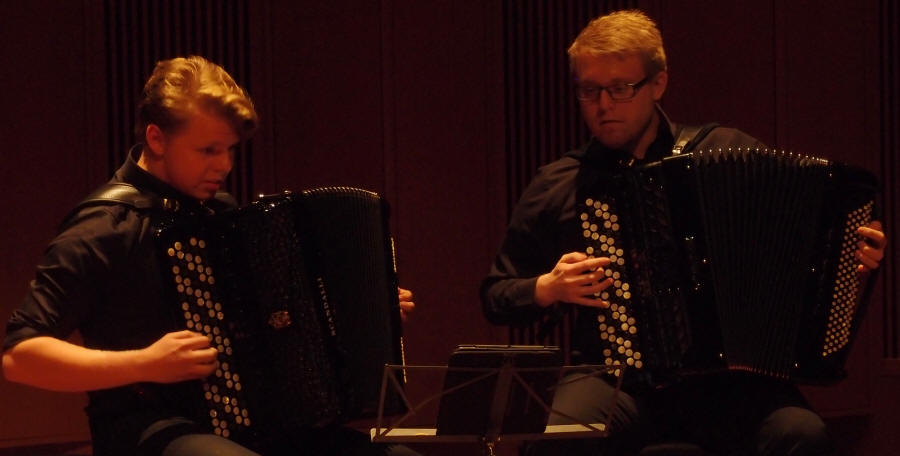 | Åsbjørg Ryeng - J.S. Bach (1685-1750): Contrapunkctus 12 fra Kunst der Fuge, BWV1080. Denne tostemte fugen var meget iørefallende og falt godt i smak hos publikum. | Andreas Angell - Edison Denisov (1929-1996): From Dusk to Light (1996).Denisov har komponert kun dette ene stykket for trekkspill og var forøvrig også utdannet matematiker. Han har benyttet en en spesiell komposisjonsteknikk hvor mørke og lyse toner i samme register møtes. En mystisk og gåtefull komposisjon. |