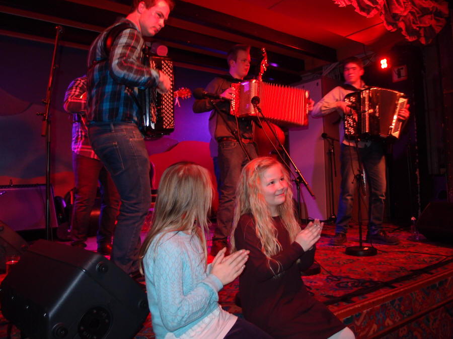 | Rebekka Plagge Rist-Larsen (t.v.) og Anna Ouff Grøthe - begge 12 år - spilte duett på konserten. De er ofte å høre under gruppenavnet "Tøffe jenter". Jentene har oppnådd flotte resultater under flere NM på trekkspill og stakk av med publikumsprisen i 2013. |
