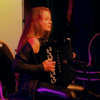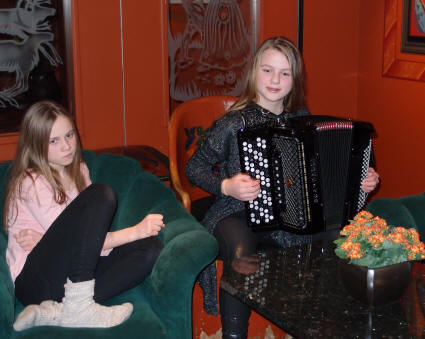 | Anna Ouff Grøthe (t.h.) 12 år fra Fisarmoniske orkester varmer opp før solonummeret | .Anna Ouff Grøthe 12 år spilte solo: "Scherzo" av John Gart |