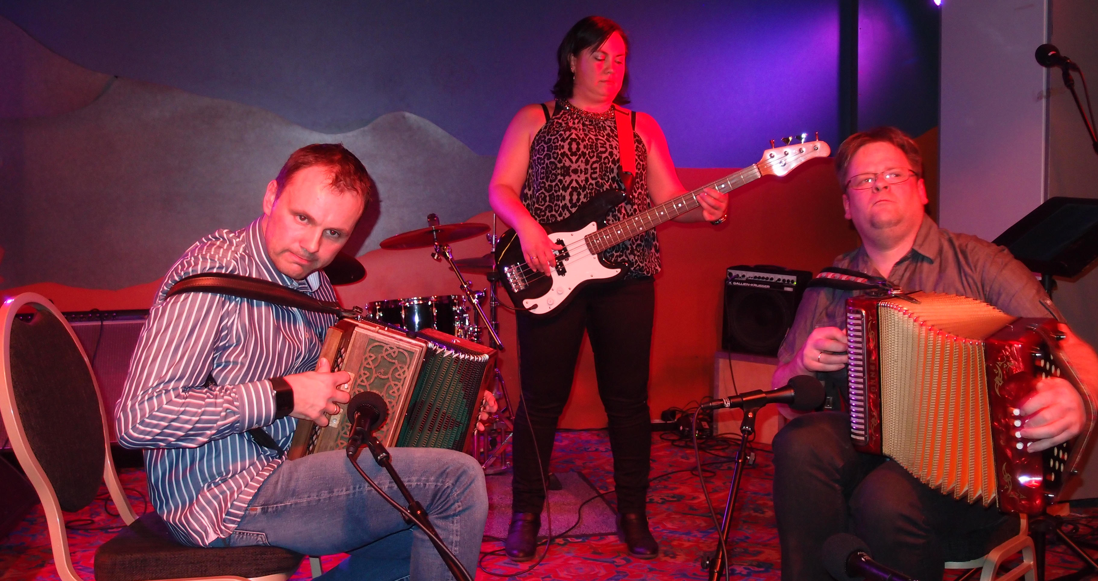 | Tørstad & Albrigtsens orkester - f.v. på torader Sondre Albrigtsen Eikrehagen, Janet Albrigtsen og Tom Kjetil Tørstad |