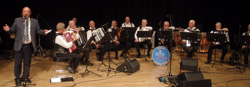 Konferansieren må vi heller ikke glemme å nevne. Dette var ingen ringere enn Gunnar GP Pedersen, en kjente stemme, programleder og entertainer fra radio og TV for oss som har levd en stund – alltid med en god historie. Han kan også sies å være mer enn gjennomsnittlig interessert i trekkspill og har alltid sitt eget lille pianospill i bagasjen – i tilfelle det skulle være bruk for det. Det ble det også denne ettermiddagen. Fakta om komponister o.l. hadde han også undersøkt godt på forhånd. |