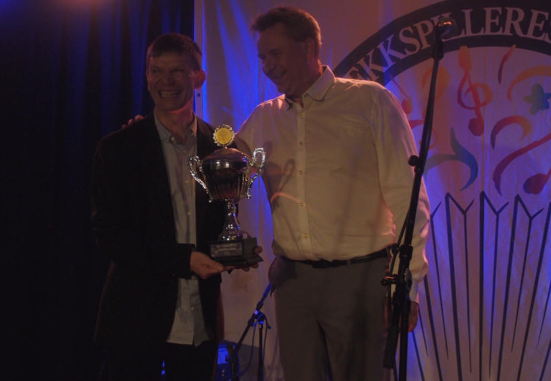 | Musikalsk leder for Malm Trekkspillklubb, Svein Kåre Haugen, kunne ta i mot vandrepokalen og kr 7.500 som vinnere av Superfinalen i gammeldans. |