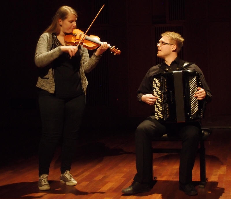 Marius Berglund (trekkspill) og Ingeborg Ulberg sommer (fele) stod for kveldens folkemusikkinnslag, og hadde valgt slåtter fra Gudbrandsdalen.