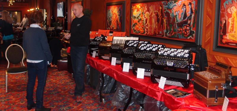 3kkspilltroll og Willy Rustad hadde salgsutstilling av nye og brukte instrumenter i foajeen og mange benyttet anledning til å slå av litt trekkspillprat.