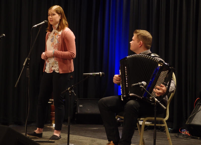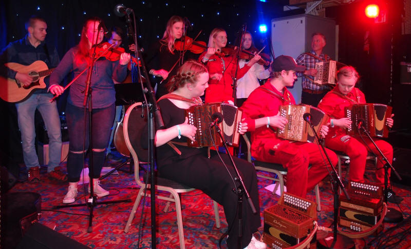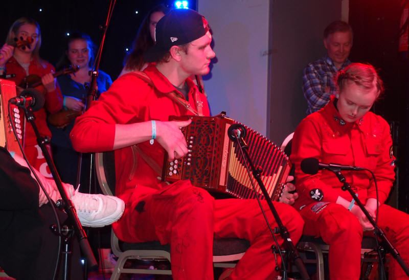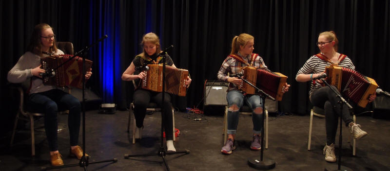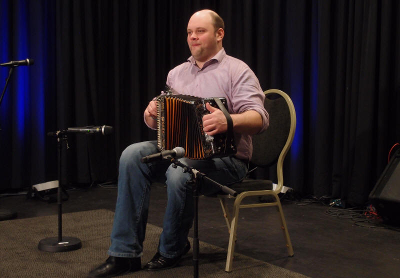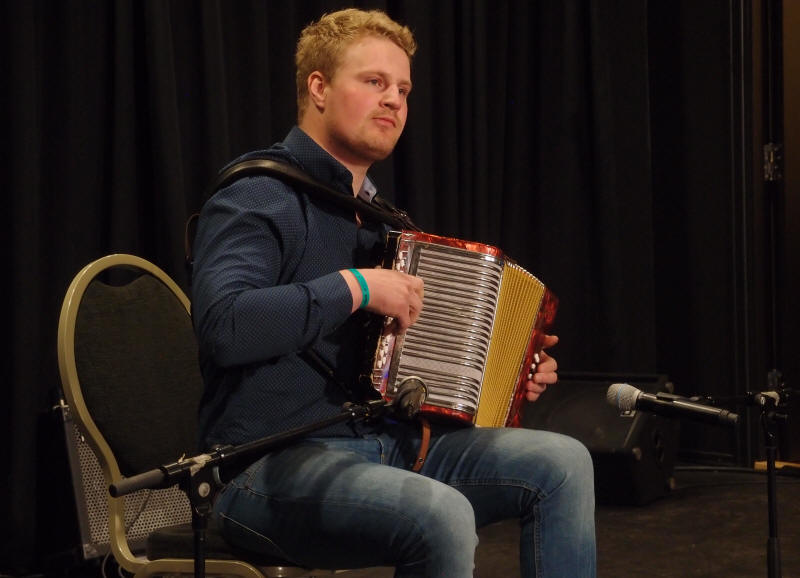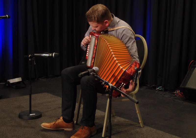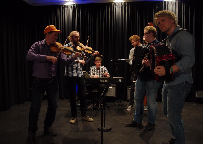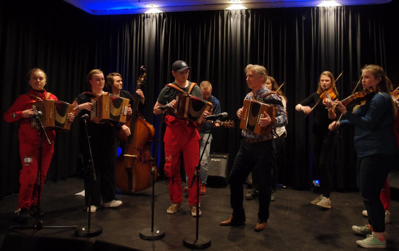 | Sondre Albrigtsen fra folkemusikklinja ved Vinstra videregående skole - her solo med en av lærer Tom Willy Rustads ( i bakgrunnen) halsbrekkende komposisjoner |