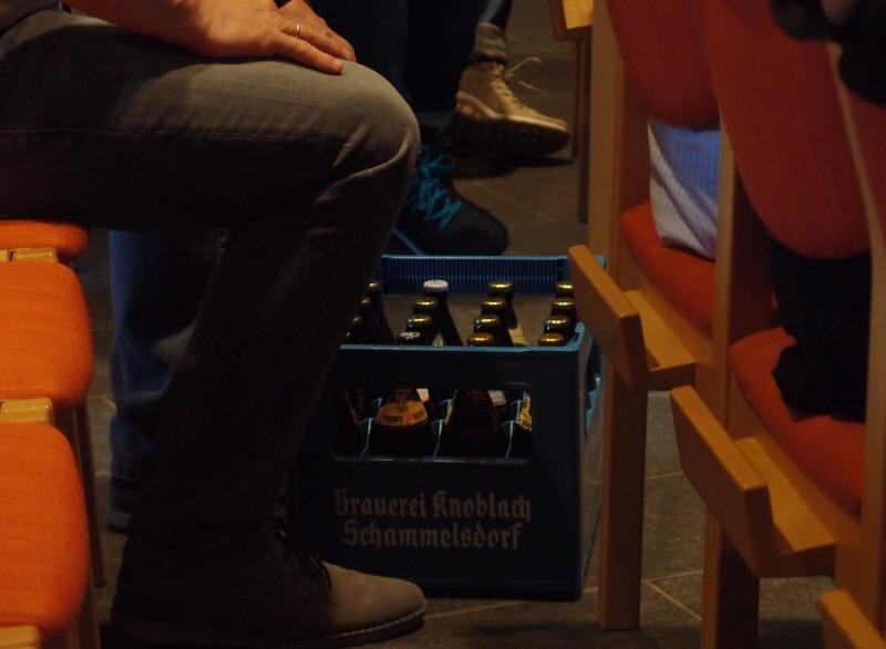 | En kasse med lokalt tyskbrygget øl observeres mellom kirkebenkene... |