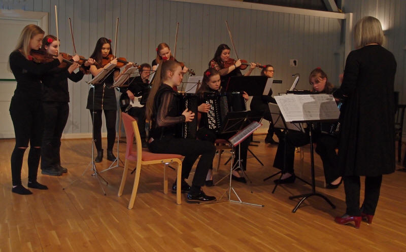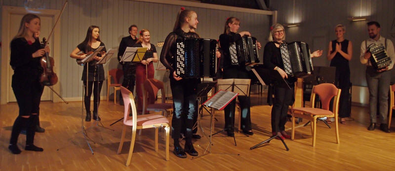 Siste avdeling var tildelt Corazón tangoorkester. Det ble mer av A. Piazzolla - 'Luz y sombra' (lys og skygge), 'Guapita' av A. Malando og 'Tango corazón' komponert og arrangert av Anders Grøthe. Som felles avslutningsnummer hadde Julie og Andreas valgt ut det krevende stykket 'Danzarin' (video) av Julian Plaza, og vi ble ganske imponert over fremføringen som gjerne blir gjort av profesjonelle 'orquesta tipica'. Corazón tangoorkester topper sine opptredener med å spille for Statsministeren 13. mai før de avvikler orkesteret av naturlig årsaker så som skolegang utenbys, flytting m.m. |