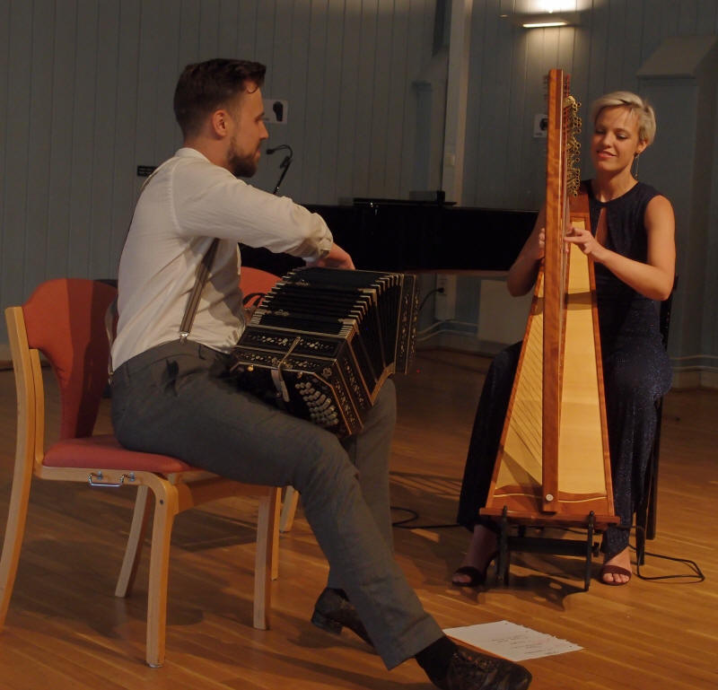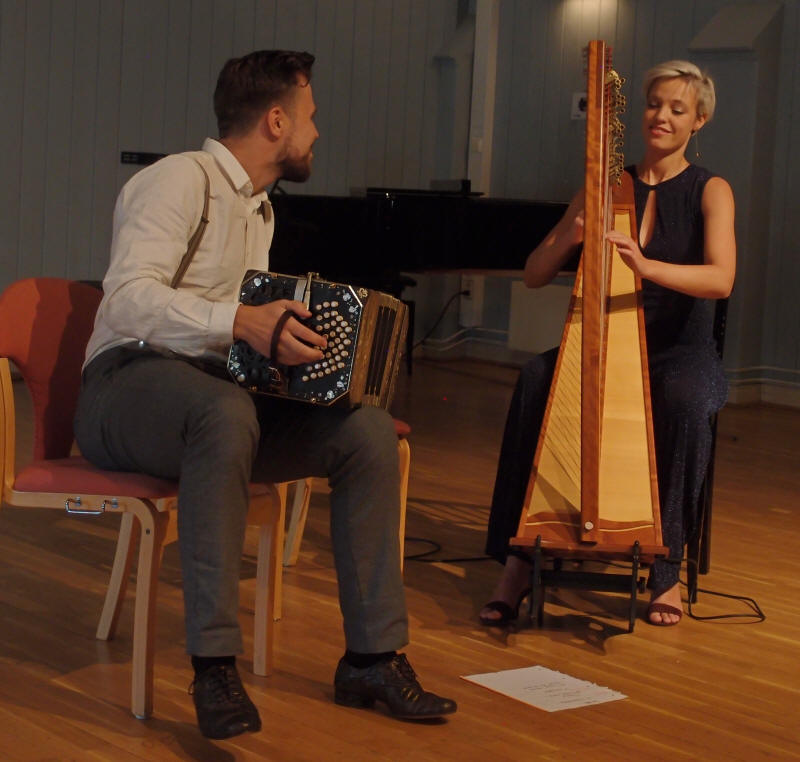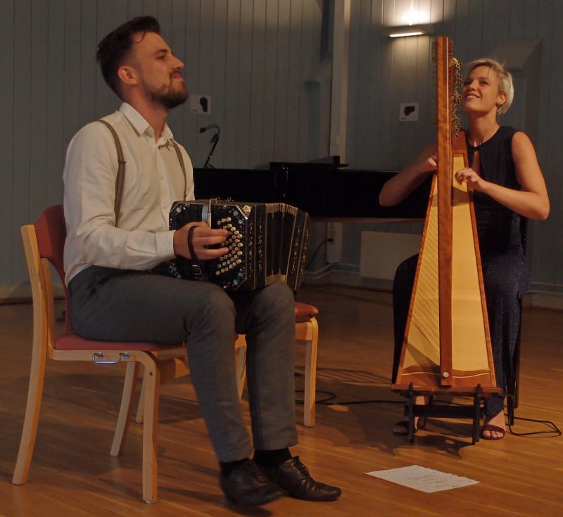 Lillebror Andreas startet å spille trekkspill 6 år gammel fordi han syntes det hadde så glade toner. Da har var 10 år spurte læreren om han var interessert i å spille bandoneon, og han tok utfordringen med å lære seg dette og gikk dermed over til melankoli. Instrumentet han spiller på i dag er nesten 100 år gammelt og er en liten boks full av magi. Det har røtter fra Tyskland på 1850-tallet og ble introdusert av Heinrich Band - derav navnet bandoneon - og med dette hadde altså tyskerne laget noe meget ulogisk når man får demonstrert hvordan f.eks. en skala spilles på instrumentet. Harpen Julie bentyttet på konserten er til sammenligning bare 3 år gammel og er en skotsk folkeharpe med klaffer som gjør at hver streng har to ulike toner avhengig av klaffens posisjon. Julie måtte til Buenos Aires for å lære spille tango på harpe. Der har også Andreas studert og begge har hver sin mastergrad på sine respektive instrumenter.Søskenparet trives godt med å spille sammen, og ved valg av 'bandnavn' havnet de på det kreative navnet duoen 'Julie & Andreas'. |