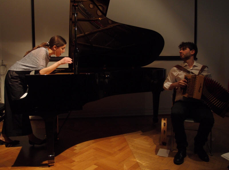 Det Italienske Kulturinstitutt i Oslo inviterer stadig til kulturelle kvelder i sine hyggelige lokaler noen kvartaler bak Slottet, det være seg forfattermøter eller musikalske innslag med f.eks. piano, fiolin og fløyte. Mandag 1. april var det klassisk piano og torader med 'Duoende' fra Italia som stod på programmet, og det var slett ingen aprilspøk. Duoen består av Giulia Grassi på klassisk piano og Francesco Berrafato på torader, og ble grunnlagt i 2016. Ensemblet har spilt i en rekke lokaler og på festivaler både i Italia og UK. Gjennom både egne komposisjoner samt nytolkning og egne arrangementer av italiensk tradisjonsmusikk og klassiske musikkverker, skaper 'Duoende' en ny klangverden og en dialog mellom ulike sjangre. Både instrumental og vokal improvisasjon er viktig i deres komposisjoner og 'live' fremførelser, noe publikum fikk oppleve og erfare denne kvelden på Kulturinstituttet. Dagen etter konserten bar det rett i studio på Universitetet i Agder hvor de skulle spille inn sitt første album. Vi ønsker dem lykke til med lydfestingen og håper å få høre dem igjen ved en senere anledning. Og ja, - de bekreftet at de er mer enn musikalske venner og trives godt i daglig selskap. |