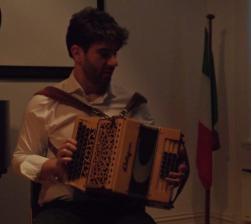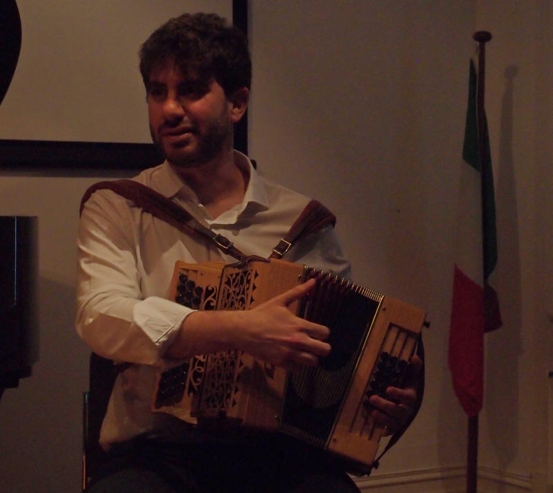 Francesco Berrafato, torader og sang: Etter å ha studert piano i mange år, utviklet Francesco en interesse for kultur- og folkemusikk. Av denne grunn har han studert trekkspill hos Maestro Allesandro Parente siden 2010. I 2011 avholdt han sin første konsert med trekkspillorkesteret 'Il Giardion della Pietra Fiorita', dirigert av Allesandro Parente. Etter denne erfaringen startet han å opptre i flere ulike sammenhenger som teatre, auditoria og festivaler. I 2012 deltok Francesco i et prosjekt kalt 'EtnoMuSa' som er det første italienske orkesteret med folke- og tradisjonell musikk, opprettet i samarbeid med det prestisjefylte universitetet i Roma 'La Sapienza'. Repertoaret for denne gruppen fokuserer på hele spekteret av italiensk folkemusikk med spesielt fokus på komposisjoner fra den sørlige delen av Italia. I 2015 startet han opp med flere andre fra gruppen et annet orkester kalt 'Musaica'. Han har deretter opptrådt med begge disse orkestrene i flere italienske byer. |