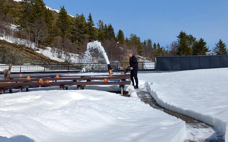 | Lars Nibstad måtte starte opp snøfreseren for å klargjøre uteplassen på taket for buskspilling. I år var det perfekt vær for utespilling i sola. |