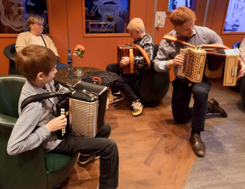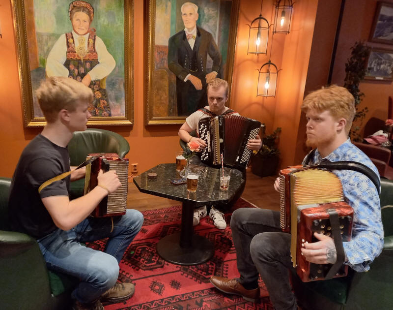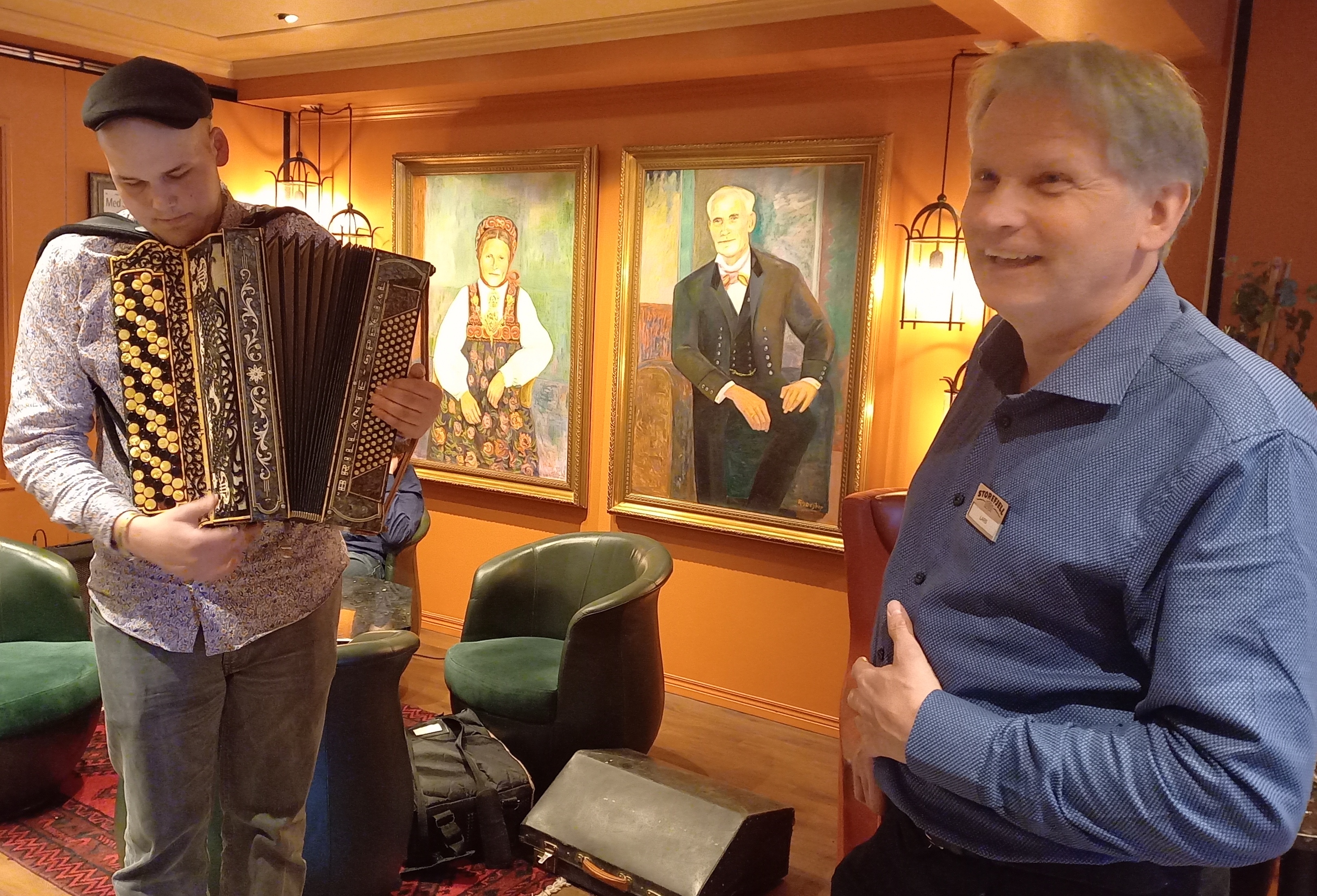 | Lars Nibstad (t.h.) hadde funnet fram det gamle trekkspill til far, Andres (avbildet på maleriet i bakgrunnen), og lot Espen Barlund Nicolaisen få ære av å prøvespille det. |