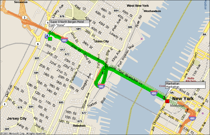| 09:01 | 0,5 | Exit roundabout onto Ramp for 0,2 km towards I-495 / Lincoln Tunnel |