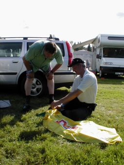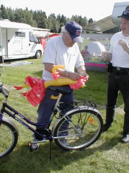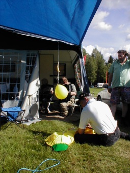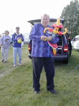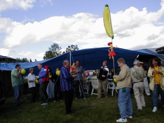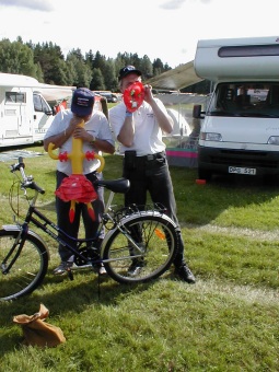 | Og så var det tid for utdeling av ballonger, selvsagt gule. | Det går også an å bruke ballongen som instrument, utrolig hvor mange forskjellige lyder man kan få ut av en slik sak. |