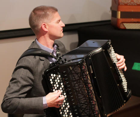 Bildet t.v.: Jo Asgeir Lie i drømmeland med lyden av "Nova". Han hadde fått låne instrumentet en snau uke på forhånd for å forberede en liten avdeling på dette konsertinstrumentet.